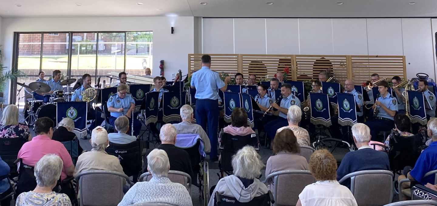 SURPRISE! Thirty members of the NSW Police Band perform at BaptistCare Bethshan Gardens aged care home in Wyee